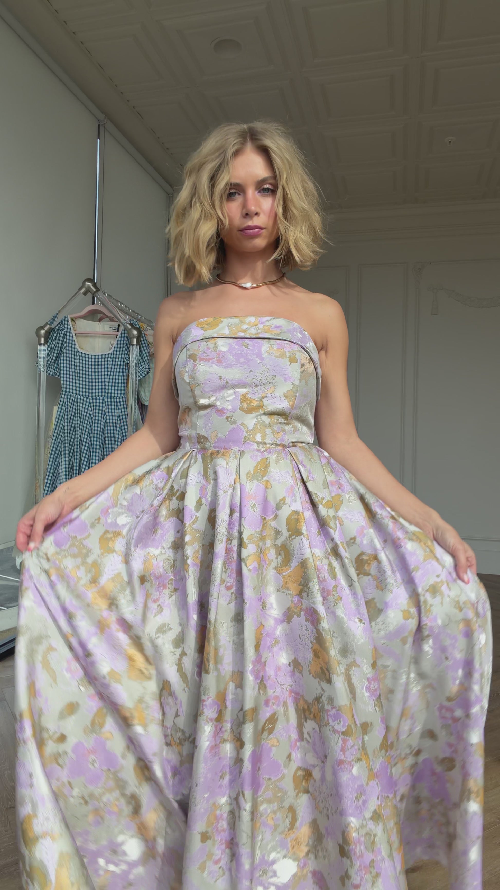 A strapless lilac dress designed for Easter, spring formals, Mother's Day, wedding guest looks, portraits, birthday celebrations, and party occasions. Featuring a sculpted strapless bodice and a flowing flared skirt, this A-line midi dress creates an ethereal, romantic silhouette in a dreamy seasonal shade.