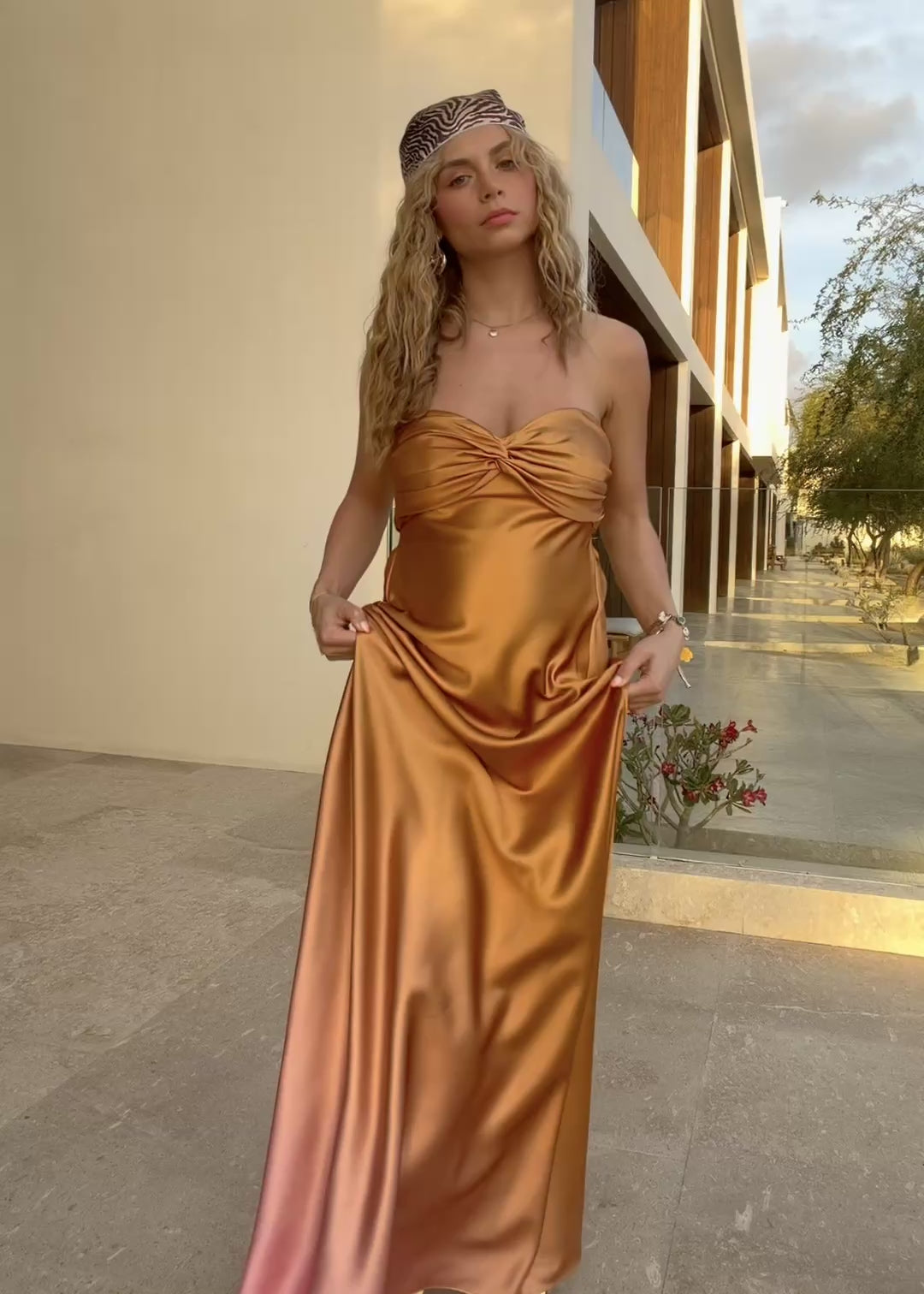 The Santorini Dress by JessaKae is a Orange Gown and A-line style Maxi dress with a sculpted Sweetheart neckline and feminine Strapless and Sleeveless sleeve.