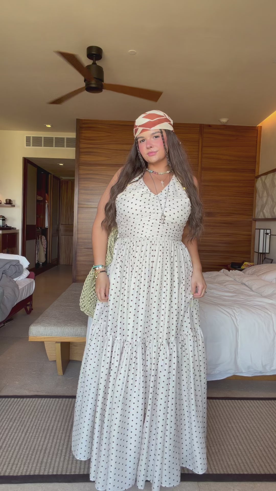 A cream & coffee polka dot dress designed for vacations, weddings, and casual outings. Featuring a flattering empire waist and relaxed A-line flow, this halter maxi dress captures laid-back sophistication.