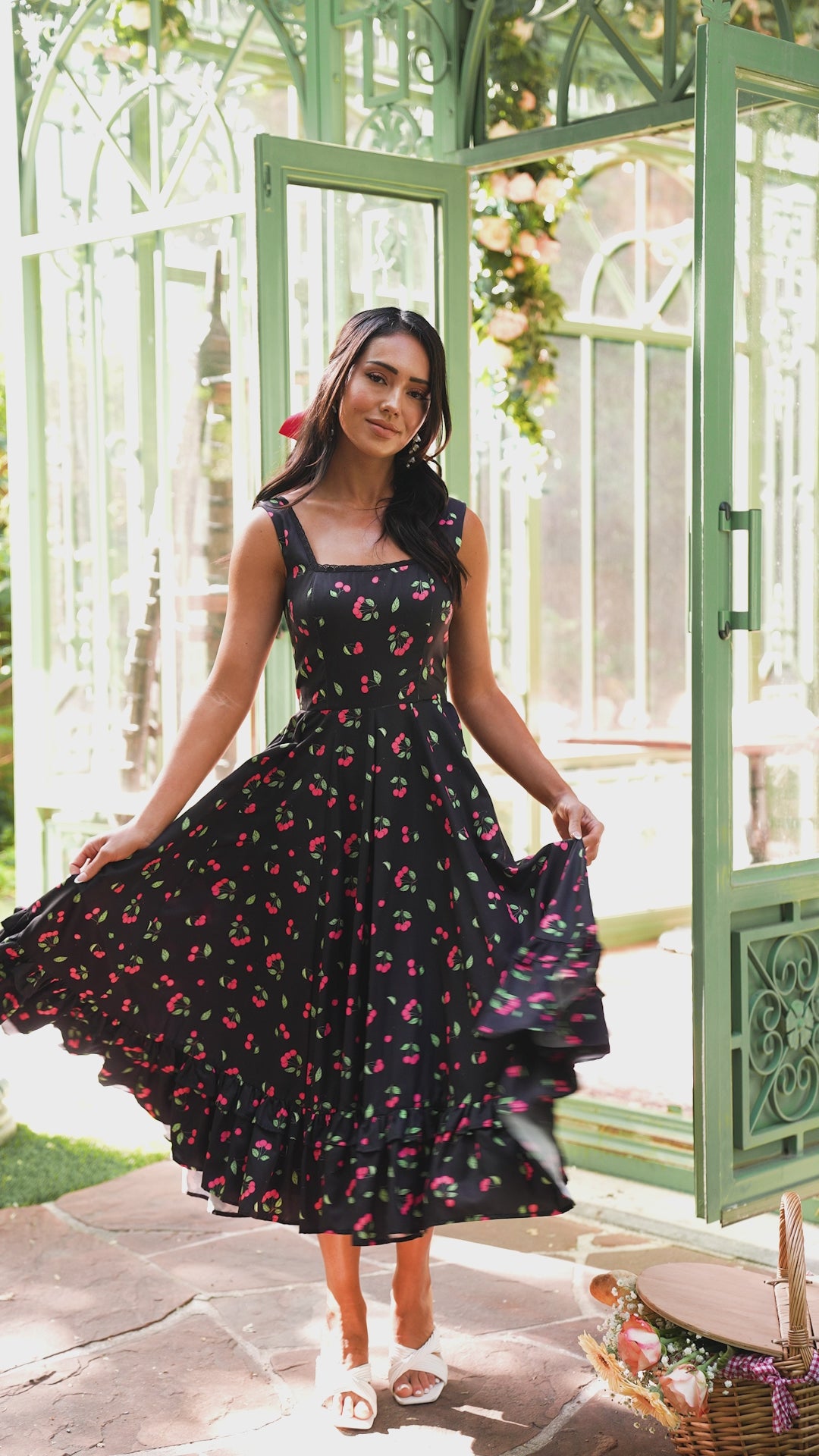 The Cherry Jam Dress by JessaKae is a Black A-line and Flared style Midi dress with a sculpted Square neckline and feminine Sleeveless sleeve.