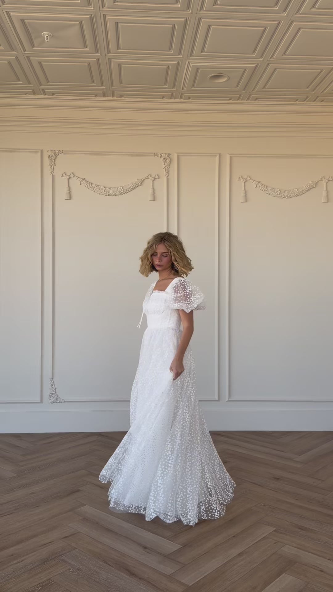 A white puff sleeve gown designed for spring brides, Easter, outdoor weddings, Mother's Day, formals, and party occasions. Featuring structured boning, a keyhole back detail, and a square V-neckline, this A-line maxi dress balances whimsical charm with refined, tailored sophistication.
