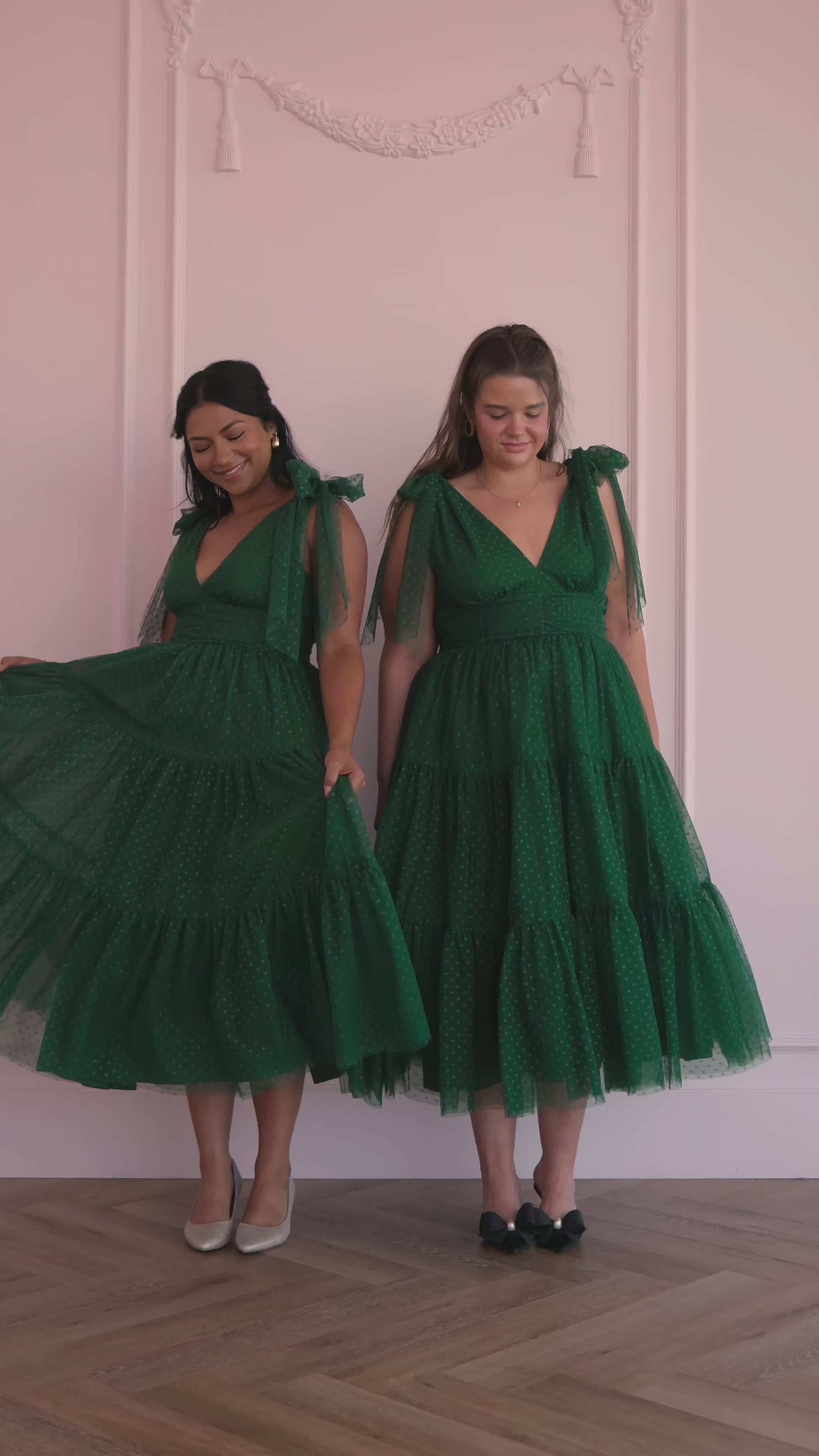 The Jeanne Dress in Green is playful, flirty, and effortlessly charming. Made from soft swiss dot tulle, it features a flattering ruched bodice, a tiered skirt for extra volume, and oversized shoulder bows that tie the whole look together. The rich green hue adds a touch of elegance while keeping things fresh and fun. Perfect for picnics, parties, or anywhere you want to make a statement with a twirl. Shop this style with floral embroidery HERE.