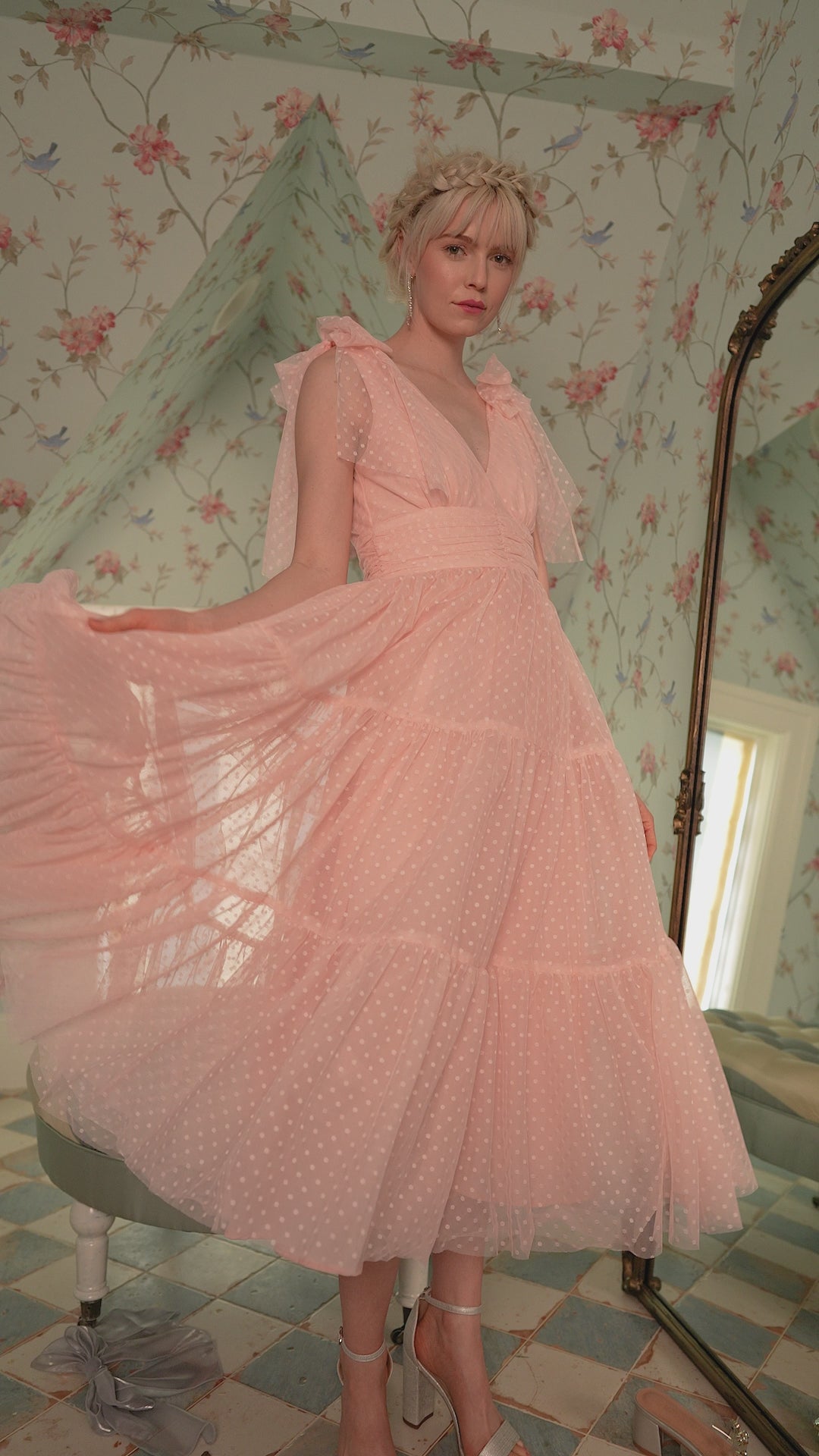 The Jeanne Dress Pink by JessaKae is a Pink A-line, Empire waist, Flared, and Tiered style Midi dress with a sculpted V-neck and Plunge neckline and feminine Sleeveless sleeve.
