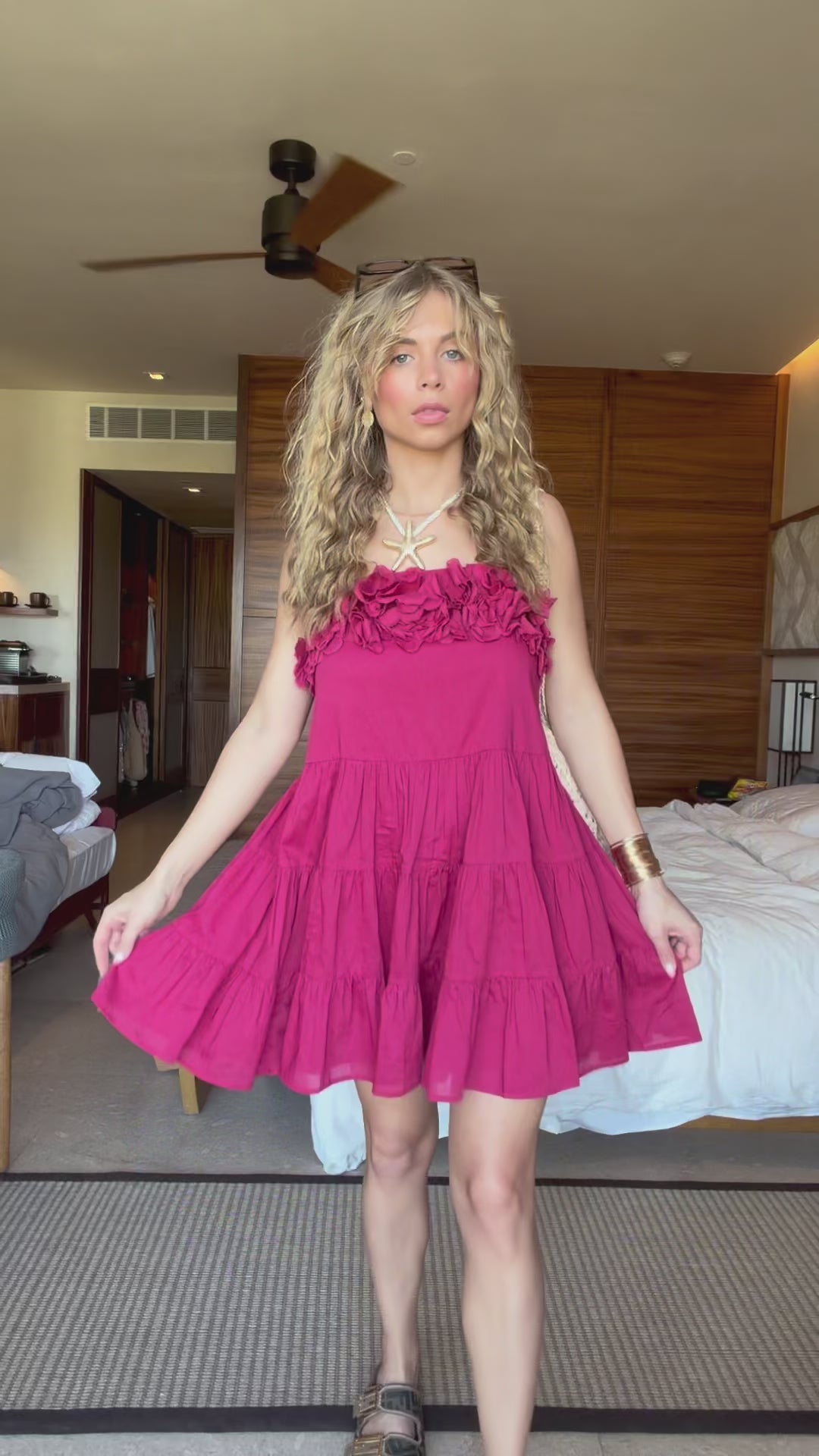 A vibrant fuchsia mini dress designed for tropical vacations, casual parties, and girls’ nights out. Featuring a playful babydoll silhouette with a relaxed shift shape, this style captures effortless, carefree charm with bold color impact.