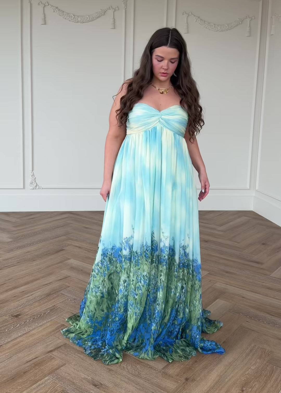 The Kimberly Dress by JessaKae is a Blue Gown, A-line, and Babydoll style Maxi dress with a sculpted Sweetheart neckline and feminine Strapless sleeve.