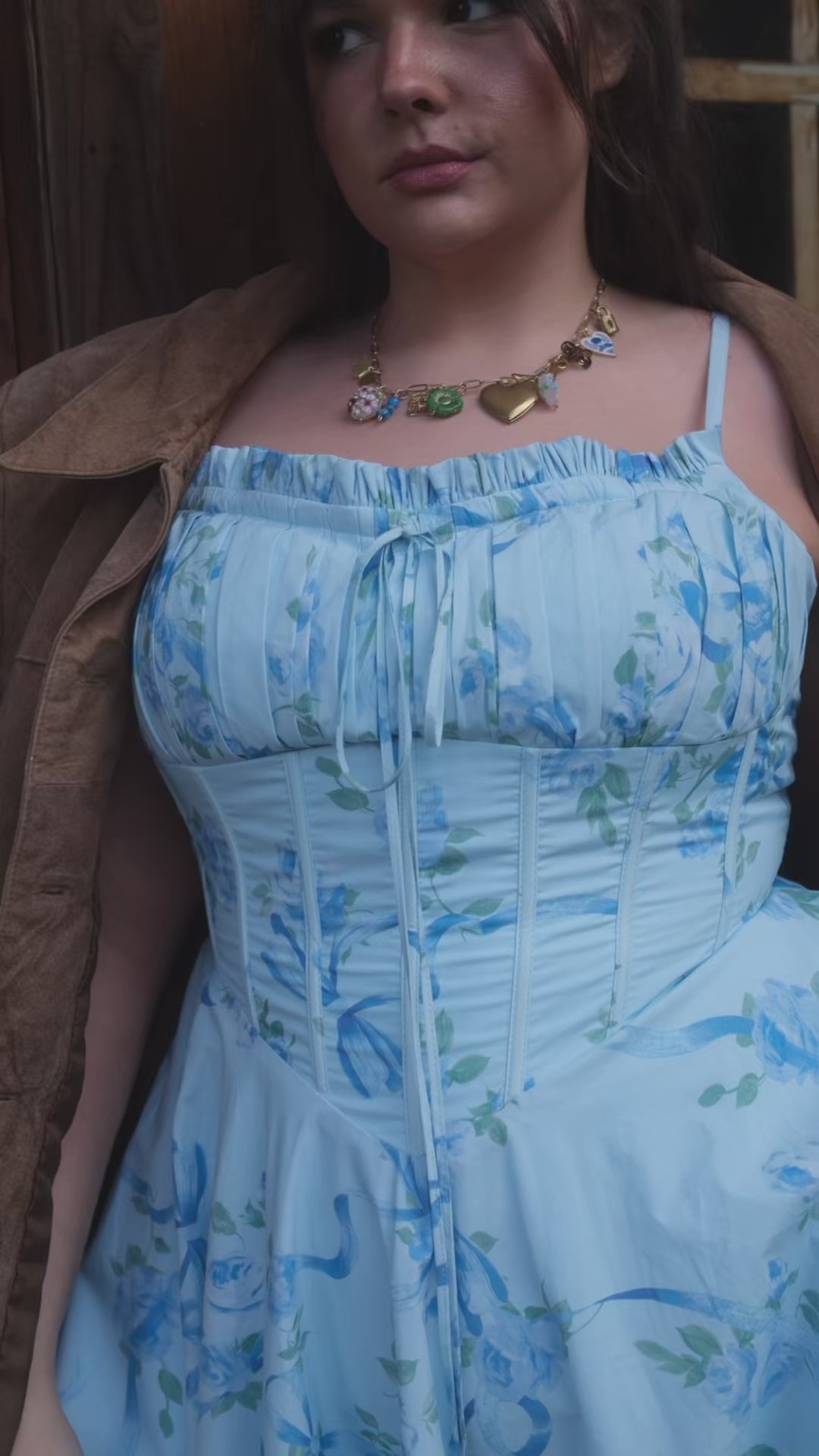 A romantic midi dress with a structured bodice, flattering V-waistline, and nostalgic blue rose and bow print. Finished with adjustable straps, a square neckline, and soft ruffle details for an heirloom-inspired look.