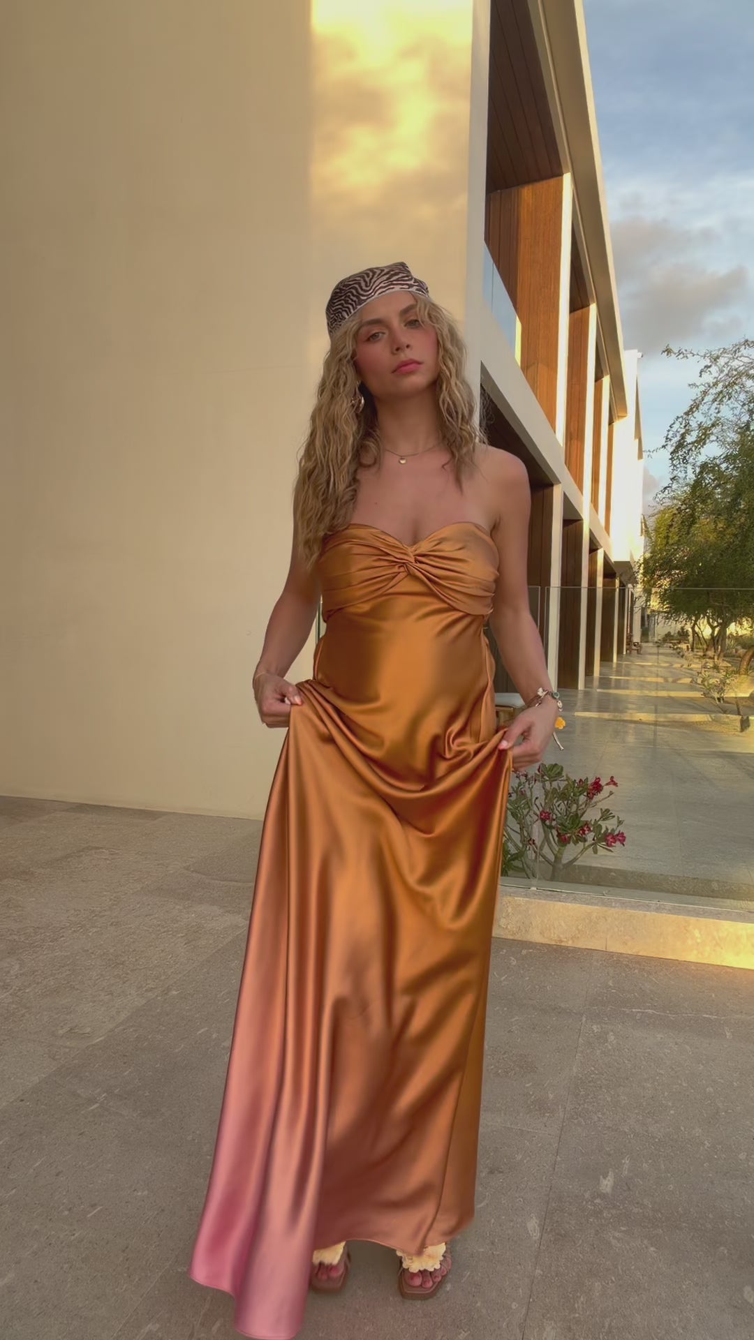 A radiant sunset gown designed for vacation evenings, destination weddings, and formal events. Blending vibrant orange into soft pink hues, this strapless satin maxi captures the magic of golden hour in motion. The sweetheart neckline and flowing A-line silhouette create a timeless, luminous statement.