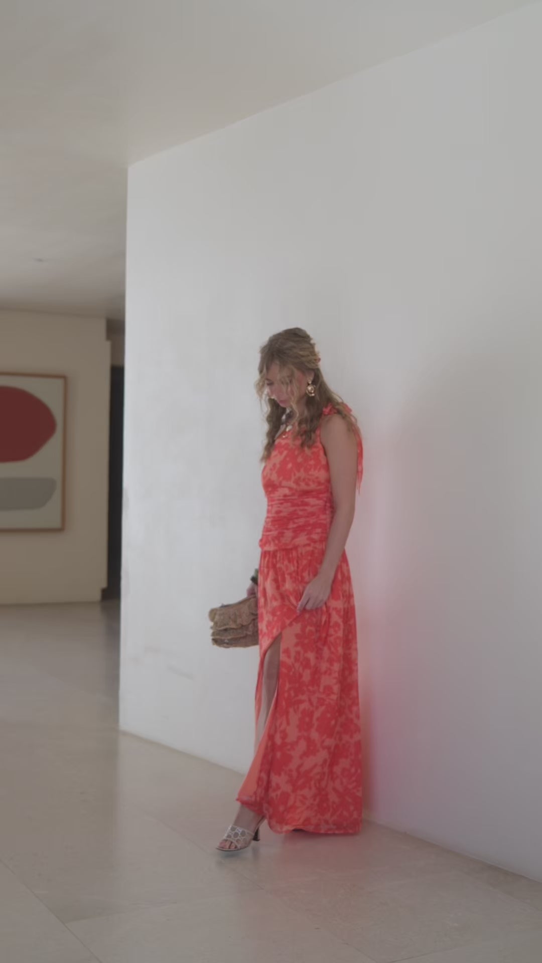 An orange dress designed for tropical vacations and destination weddings. Featuring a dramatic fitted silhouette and asymmetrical sleeve, this drop-waist ruched maxi dress captures sultry, resort-ready energy.
