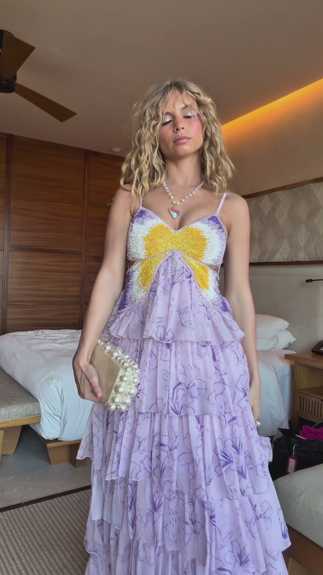 An intricate hand beaded evening gown designed for formal events, tropical vacations, and quinceañeras. Sculptural in design, this etherial sleeveless gown is artfully shaped with side cutouts that contour the bodice to form a butterfly-inspired silhouette.